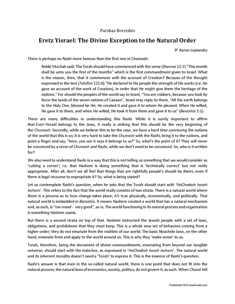 📄Bereishis 5786 – Eretz Yisroel, The Divine Exception to the Natural Order (TorahWeb 2025)