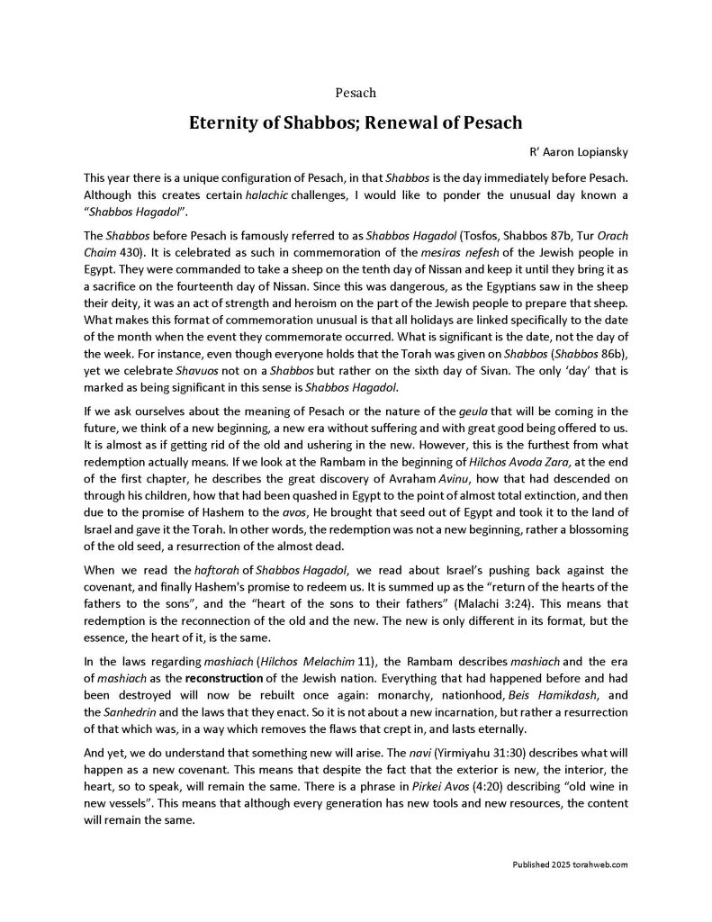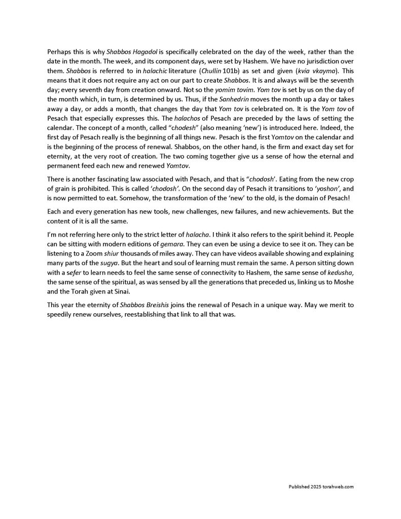 📄Pesach 5785 – Eternity of Shabbos, Renewal of Pesach (Torahweb)
